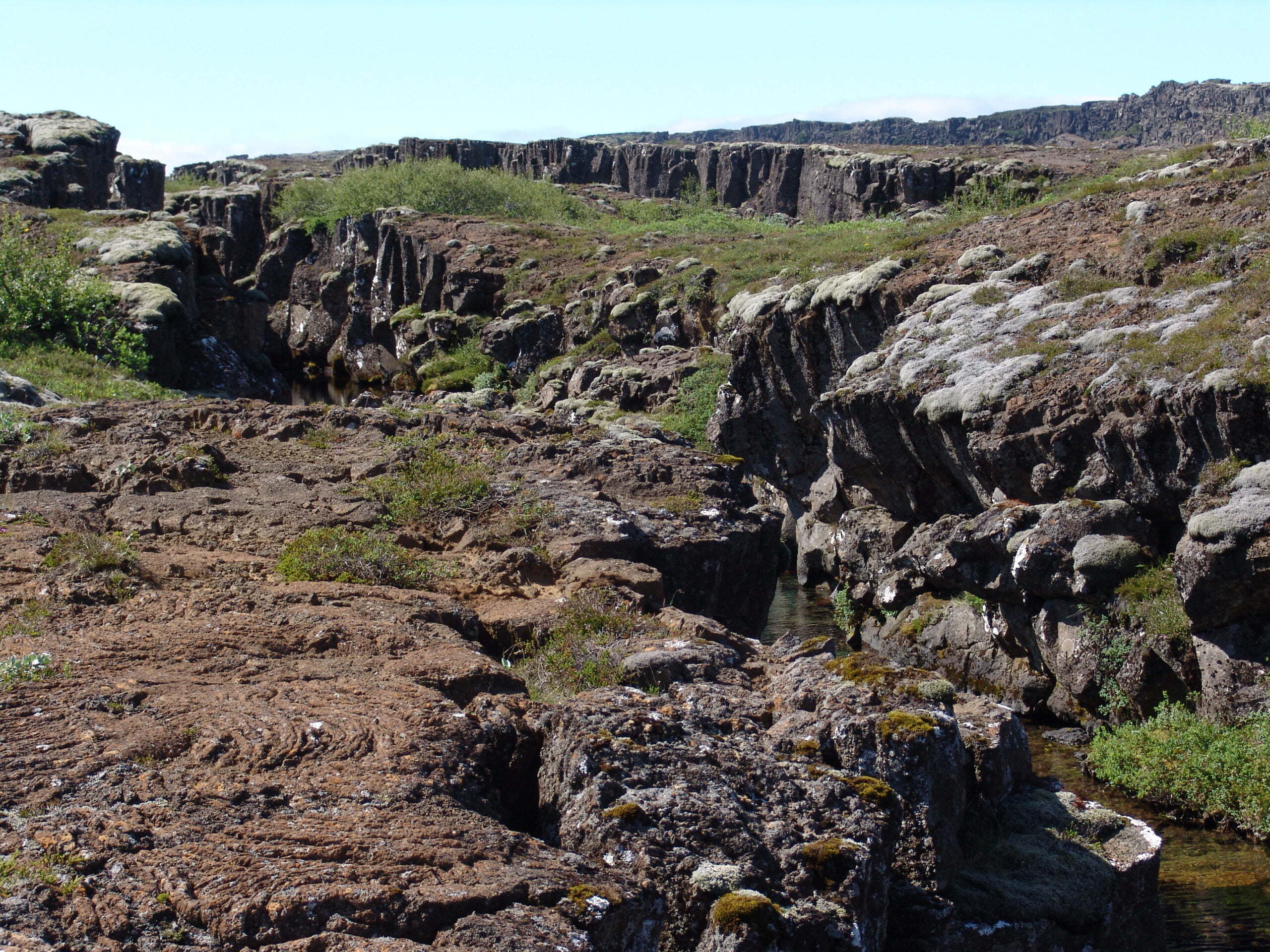 Almannagjá i cała dolina Thingvellir systematycznie się poszerza. Bo właśnie w tym miejscu łączą się płyty tektoniczne Eurazjatycka i Północnoamerykańska. Choć w zasadzie oddalają się od siebie z prędkością według różnych badaczy szacowaną od 1,5 do 3 cm rocznie. A to oznacza, że w tym miejscu, oprócz częstych trzęsień ziemi, musza być i wulkany. I są. Skaldbreidur (1060 m) to tzw. wulkan tarczowy, czyli dość płaski, który nigdy nie wybucha, za to zwykle wypływa z niego płynna, zasadowa lawa. Wulkany tego typu są w dwóch miejscach na świecie, na Hawajach (m. in. potężna Mauna Loa) i właśnie na Islandii.